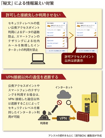 一つ目は、秘文を使って「許可した接続先しか利用させない」という提案だ。秘文の接続先をチェックする機能で許可したアクセスポイント以外は接続を遮断する。二つ目は、「VPN以外の通信を遮断する」という提案。社外は、必ず社内のVPNサーバーを経由させることで、社内と同様のセキュリティポリシーを適用できるというわけだ。