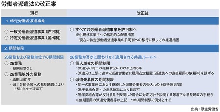 一方、26業務以外は一般労働者派遣となり、派遣事業を始めるにあたって、資産や現預金の額、事務所の広さなどに要件が定められている。法改正では派遣企業の健全性が目的の一つであることから、許可制に統一される。特定労働者派遣事業を営む派遣会社が存続できるかどうかは、その許可の基準次第というわけだ。「一般労働者派遣の基準を満たすのも難しい。派遣会社の淘汰か合併が進むのではないか」と、小規模派遣会社の経営者はため息交じりで言う。