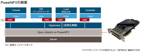 具体的には、NFVアシスト機能を実装したネットワークボードと、NFVのソフトウェア部分をセットにした製品「PowerNFV」を開発(図参照)している。「ハードとソフトのすり合わせ方式」(門田部長)によって、長年ネットワーク機器を開発してきたアルチザネットワークスの強みを生かすとともに、処理速度の速さで他社を圧倒する差異化策を打ち出している。スイッチなど通信特有の負荷を専用ネットワークボードのハードウェアで処理し、ロードバランサーやファイアウォールなどはソフトウェアで処理する。「PowerNFV」はこの秋から本格的な量産体制に入り、3年後にはNFV関連ビジネスを同社の全売上高の3割ほどを占めるまでに育てたいという考えを示す。