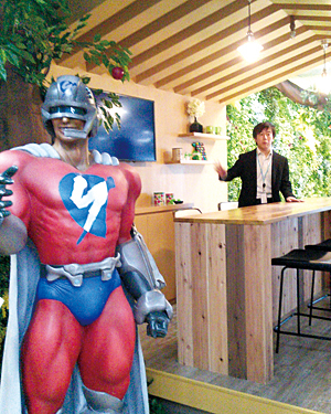 「サイボウ樹パーク」と呼ばれるコミュニケーションスペースを案内するサイボウズの青野慶久社長