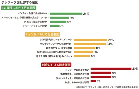 盛り上がりをみせたテレワーク週間だが、普及にはさまざまな阻害要因がある。日本マイクロソフトが昨年実施したアンケートによると、仕組みや制度がないだけでなく、“マインド”がテレワークの採用を阻害していることがわかる(表を参照)。インフラやツールが揃っているにもかかわらず、テレワークが普及しなかった理由がそこにある。