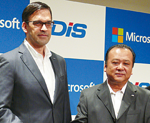 握手する日本マイクロソフトの平野拓也社長(左)とダイワボウ情報システムの安永達哉専務他のディストリビュータにも期待