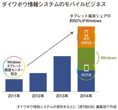2011年にWindowsタブレット推進センターを設立したことで、ダイワボウ情報システムは、モバイルデバイスのビジネスが好調に推移している。昨年度(15年3月期)は、モバイルデバイスの販売が53万台超を記録した。Windows搭載タブレット端末が大きく寄与しているという。ダイワボウ情報システムの安永達哉・専務営業本部長は、「タブレット端末の販売台数シェアのなかで、約50%がWindows」としている。加えて、法人向け携帯電話の市場環境は、フィーチャーフォンからスマートフォンへの移行が急速に進んでいる。そこで、センターをタブレット端末の利用促進を中心とした機能から、スマートフォンまでを網羅した機能に拡張することになった。