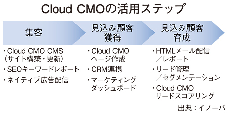 そうしたノウハウを生かし、昨年9月には、コンテンツマーケティングに特化した自社開発のクラウド型マーケティングツール「Cloud CMO」をリリースした。マーケティングやITのスキルに乏しいSMB向けに、短期間でのオウンドメディア構築やアクセス解析、ブログ制作、SEO対策、SNS投稿、メールマガジン配信、リード管理など、コンテンツマーケティングのための機能をオールインワンで提供するというコンセプトだ。さらに、今年9月には、ウェブサイトへの集客から見込み客の獲得、育成までのプロセスを網羅するマーケティングオートメーションとしての機能を強化し(図を参照)、Cloud CMOをSMBに本格的に浸透させるべく、販売チャネルの整備にも取り組み始めた。