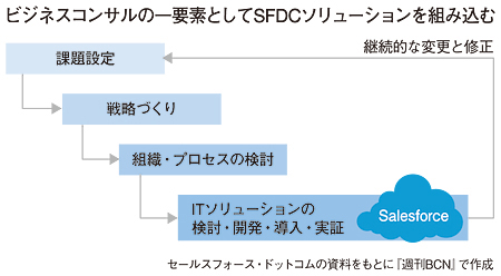 セールスフォース・ドットコム(SFDC、小出伸一会長兼CEO)は、業種別ソリューション開発のための新しいパートナープログラム「Salesforce Fullforce」を日本で立ち上げた。参加メンバーには、グローバル市場で活躍するコンサルティングファームの日本法人やグループ法人が名を連ねる。彼らのビジネスコンサルソリューションの一要素としてSFDCのサービス群を組み込んでもらい、顧客のビジネスモデルそのものの変革を支援し、それを実現するためのITシステムの開発・提供までを一気通貫でスピーディに行うことを意図した取り組みだ。SFDC曰く、「(SaaS、PaaS市場のトップベンダーである)当社だけが実現できる最先端のパートナーエコシステム」で、従来のITビジネスの枠を越えた価値の実現を目指す。(本多和幸)