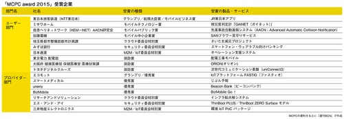 2015年12月、モバイルコンピューティング推進コンソーシアム(MCPC)主催の「MCPC award 2015」の表彰式が都内で開催された。業界の枠を越えてモバイルコンピューティングやIoT/M2Mシステムの普及促進を目的に掲げる同コンソーシアムでは、03年からIoT/M2M分野でモバイルシステムの導入成果を上げた事例を顕彰している。13回目となる今回の表彰式には、各部門で受賞した17社が集結した。(取材・文/小池晃臣(フリージャーナリスト))