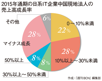 【上海発】日系IT企業の中国ビジネスの成長率が減速している。BCN上海支局が50社を対象に2015年通期の動向を調査した結果、過半数の中国現地法人の通期売上高が、中国IT市場全体の成長率を下回ったことが明らかになった。日本向けオフショア開発のコスト構造が厳しくなっていることに加え、日系IT企業のほとんどが依存している現地の日系企業マーケットが、飽和状態に向かいつつあることが大きな要因となっている。(上海支局 真鍋 武)