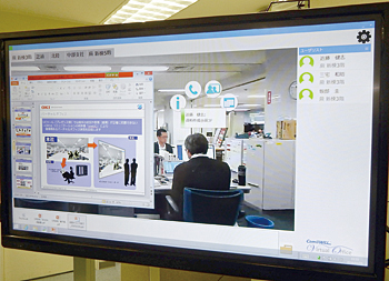 遠隔地拠点との間で対話や資料の共有ができる「バーチャルオフィス」 働き方改革では、ビデオ会議と、「在席」や「会議中」といったプレゼンス表示を組み合わせることで、離れた拠点同士でオフィスの状況を共有できるバーチャルオフィスシステムを提案。大型ディスプレイに遠隔地の社内の映像を表示するとともに、必要な人に簡単に連絡がとれるよう、画面にタッチすることで音声通話などを開始できるユーザーインターフェースを設けた。現在、沖電気社内の複数拠点間で運用を試行しており、2016年度中の商品化を目指して開発が行われているという。