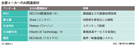 一方、国内大手コンピュータメーカーの商材を見渡してみると、NECや富士通、日立製作所、東芝のいずれもAIに取り組んでいる。NECはもち前の画像処理技術を生かした顔認証、富士通はAI技術を体系化した「Zinrai(ジンライ)」、日立製作所は強みのアルゴリズムを前面に押し出し、東芝はクラウド型の音声・映像認識「RECAIUS(リカイアス)」がAIの看板商材となっている。これらにはフロントエンド系もあるが、まだWatsonのようにPaaS型で提供するというかたちには至っていない。