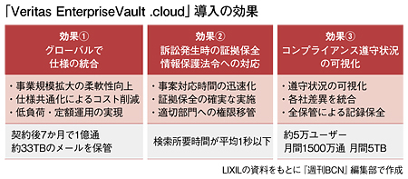 ノンコア業務にはパッケージを導入してシステム刷新を進めるという流れのなかで、コンプライアンスに向けてメールのアーカイブを検討。ベリタステクノロジーズのバックアップソフト「Veritas EnterpriseVault .cloud」を選択した。これにより、1か月平均で1500万通におよぶメールを保管してコンプライアンスを実現しているかどうかを可視化できたほか、メールの検索所要時間が平均1秒以下となって、情報保護法や訴訟の発生などでメールを早く提出しなければならない状況にも対応が可能となった。小和瀬CIOは、「昨年秋に導入し、契約後7か月が経過した今年1月の時点で1億通のメール、約33TBのデータを保管しているが、グループ全体で活用するというグローバルでの仕様統合によってコスト削減を果たしている」と満足げだ。