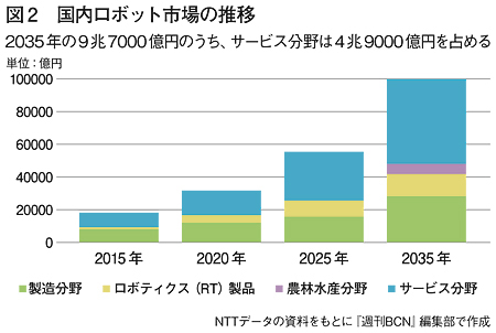 NTTデータの調べによれば、国内ロボット市場のうち、最も伸び率が大きい領域が、コミュニケーション領域を含むサービス提供型のロボットだ。これまでロボットといえばFA(工場自動化)領域がメインだったが、2025年にはおよそ半分がサービス領域で活用されるロボットビジネスが占める見通しだ(図2参照)。この原動力となるのが、企業の情報共有系システムのデータ連携が容易になり、ビッグデータ分析やAIエンジンの技術的向上によるところが大きい。デバイス(端末)としてのロボットは、顔認識用のカメラと会話用のマイクとスピーカーがあればよく、基本的にはスマートフォン程度の機能で十分。但し、スマートフォンと会話するのは抵抗がある。愛嬌のある人型のロボットであれば話しかけやすい。