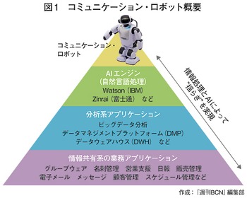“揺らぎ”の実現には、そのバックヤードでさまざまな仕掛けを構築しなければならない。まずは、社内の情報共有系システムとのつなぎ込みと、これらの情報を解析し、有用と思われるデータを抽出、さらにこれを「Watson(IBM)」や「Zinrai(富士通)」といったAIエンジンで解析し、自然言語処理によって日常のさりげない会話に織り交ぜる(図1参照)。ロボットが誰にでもべらべらしゃべるのは都合が悪いため、社員の顔を認識し、その人の属する部門や属性、職制に合わせて会話の内容を変えることで、初めて“揺らぎ”が成立する。