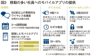 インテルがデバイスやサーバーなどを増やしているのは、業務効率化を図るためではない。「生産性、デジタル化、サイバーセキュリティなどの観点で成果を出すためだ」と邱APAC and Japan地域部長はいう。生産性においての成果としては、オフィス内で効果的な会議を行うために革新的なワイヤレス会議室を500室以上設置、製品検証時間の短縮、社員に対するモバイルアプリ提供の増加などがある(図3)。デジタル化については、効率性とコスト削減によって8億ドル以上のビジネス価値を生み出したほか、インサイトの待ち時間の短縮、サーバー処理能力の最適化による製品設計サイクルの迅速化などを果たしている。
