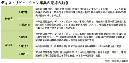 2015年8月7日、神州数碼控股は、ディストリビューション事業を手がける神州数碼(中国)などの子会社(神州数碼集団)の株式100%を、条件つきで深セン市深信泰豊(集団)に売却する契約を交わした。売却金額は総額40億1000万元。その後、中国証券監督管理委員会(CSRC)の承認を経て、売却は16年3月9日に完了した。