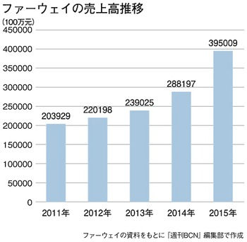 取締役副会長 ファーウェイの勢いが止まらない。中国最大のICT企業である同社は、いまなお高成長を維持している。2015年度(15年12月期)はすべての事業が2ケタ成長を遂げ、通期売上高は3950億元と前年度比で37%拡大した。もっとも規模が大きい通信事業者向け事業は、グローバルで4Gネットワークの展開が継続し、通信事業者の設備投資が旺盛。サーバーやネットワーク機器、DCソリューションなどの法人向けICTソリューション事業は、パブリック・セーフティ、金融、運輸、エネルギーの各産業向け事業が急速に成長した。コンシューマ向け事業の売り上げはスマートフォンが好調。15年のグローバル出荷台数は、前年比44.3%増の1億660万台と、主要メーカーのなかで最大の伸び率を示している(IDC調べ)。