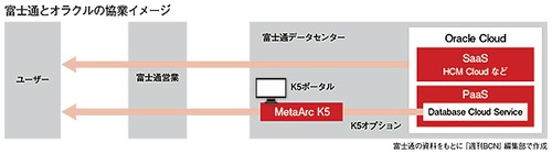そして二つめのポイントが、富士通とオラクルのクラウドビジネスそのものでの連携だ。富士通も昨年、同社が蓄積してきたSIのノウハウ・技術を余すところなく詰め込んだIaaS/PaaS「MetaArc K5(K5)」を、クラウドビジネスの切り札として発表した。このK5のオプションとして、Oracle Cloud Platformに含まれるDBサービスである「Oracle Database Cloud Service」をK5のポータルから利用できるようになる。サポートサービスまで、富士通がワンストップで提供する方針だ。また、ユーザーがK5ではなくOracle Cloud PlatformをPaaSとして選択したいという場合も、富士通が窓口となり、クラウド上でのSI込みでOracle Cloud Platformを再販するかたちになる。
