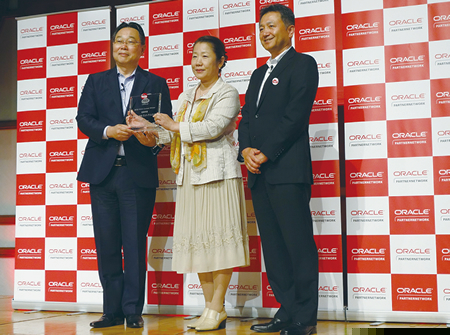 第2回POCOコンテストの最優秀賞を獲得した中本・アンド・アソシエイツ。中本映子・代表取締役プロジェクトディレクター(中央)が日本オラクル・杉原社長からトロフィーを受け取る