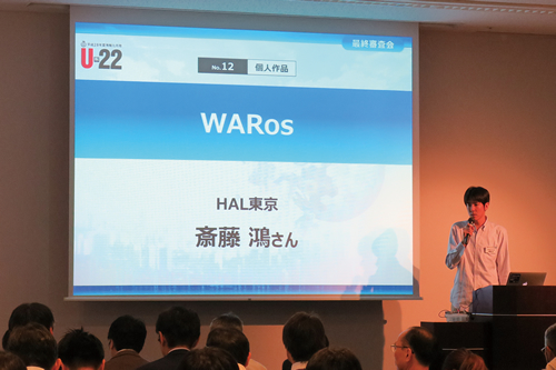経済産業大臣賞テクノロジーに選ばれたのは、HAL東京の斎藤鴻さんの自作OS『WARos(ウォー・オーエス)』。ゲームやスマートフォン向けアプリの応募が多いなかで、独自のOSで応募した。『WARos』はIoTに最適なOSで、組み込み環境に応じて、必要な機能だけを搭載。不要な機能を落とすことで、ネットワーク経由で攻撃されるリスクを減らし、また高速起動ができるなどの利点もある。