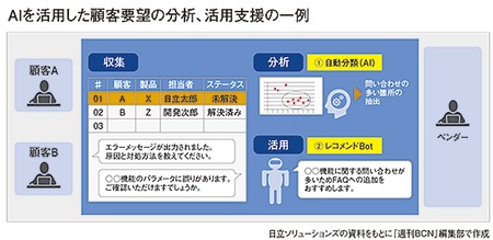 日立ソリューションズでは、さらに踏み込んで文書を分類したり、内容を読み取って提案する領域への進出を目指している。請求書や領収書の管理を「SoR(記録型システム)」とすれば、文書の分析/活用は顧客の売り上げや利益に直接的に役立つ「SoE」の領域だといえる。分析や活用に向けて提案するのはAIの役割で、例えば顧客接点であるコンタクトセンターでやりとりした内容を分析し、問い合わせの多い箇所を自動的に抽出したり、よくある問い合わせ一覧(FAQ)への追加を提案することで、データの活用に役立てることを想定(図参照)。早ければ来年春頃には製品に実装していく予定である。