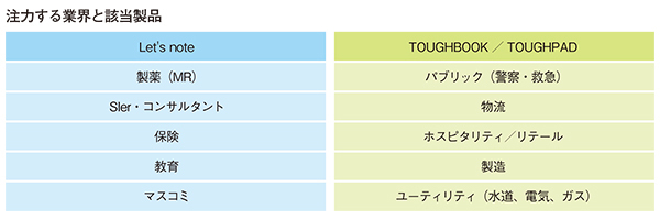 製品別ではTOUGHシリーズはすでにソリューションとのセット提案が進んでおり、ソリューションビジネスへの切り替えが比較的容易だ。今後はさらなる強化を図る。一方、Let's noteは、PC単品で購入する顧客が多い。今後はセキュリティや廃棄時のデータ消去サービスなどを組み合わせて提案していく方針だ。