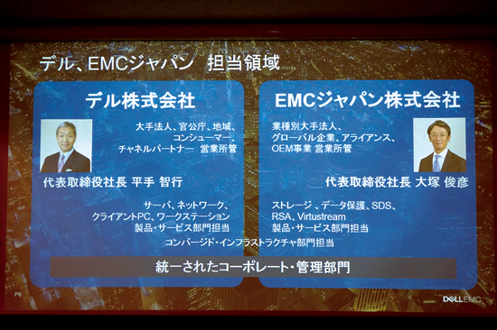 一方で、ワンカンパニーの戦略のもとで動く個別、特定の製品分野ごとのスペシャリティ営業・SE部隊も組織し、重複しないかたちでデル、EMCジャパン、それぞれの担当領域も決めた(左下写真)。デルが大手法人、官公庁、地域、コンシューマ、チャネルパートナーを、EMCジャパンが業種別大手法人、グローバル企業、アライアンス、OEM事業を担当する。製品分野としては、デルがサーバー、ネットワーク、クライアントPC、ワークステーションを、EMCジャパンがストレージ、データ保護、SDS、RSAの事業、バーチャストリームの事業を担当する。コンバージド・インフラストラクチャは両社共通の担当領域となる。法人格の統合はまだ先になることから、一応は法人ごとの管掌を決める必要があったということのようだが、平手社長は、「エンド・トゥ・エンドの幅広い製品群、ソリューションをワンカンパニーとして提供していくことに変わりはない。人材も一体的に運用しており、組織統合に伴って、従来のデルのチームにEMCジャパンからリーダーが来て、その上司はデル所属だったりというケースも出てきたし、もちろんその逆もある」と強調する。
