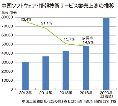 2016年の中国IT市場は堅調に推移した。中国工業和信息化部(工信部)によると、SIerやISVが対象となる中国ソフトウェア・情報技術サービス業の16年通期売上高は、前年比14.9%増の4兆8511億元だった。成長率は昨年から0.8ポイント低下。中国経済の成長鈍化に伴い、年を追うごとに落ち込んできているが、それでも2ケタ以上の成長を維持している。