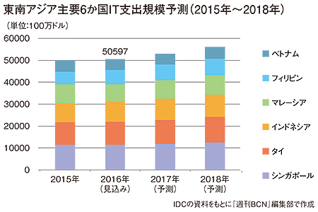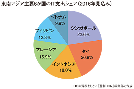 世界中のIT市場を調査しているIDCでは、東南アジア地域の主要6か国(シンガポール、タイ、インドネシア、マレーシア、フィリピン、ベトナム)のデータを保有している。同社によれば、2016年の主要6か国のIT支出規模(見込み)は505億9700万ドル。1ドル当たり115円で単純換算すると約5兆8186億円に相当する。同年の日本のIT市場規模は約14兆6706億円なので、東南アジア地域主要6か国のIT市場規模は、まだ日本の2分の1以下ということになる。