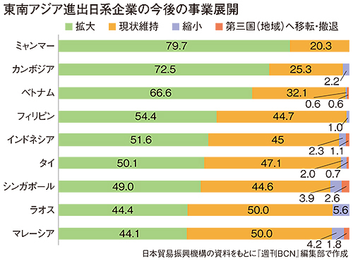 では、東南アジア地域に進出している日系企業は、今後どのような事業展開を図っていくのか。日本貿易振興機構(JETRO)の「アジア・オセアニア進出日系企業実態調査」によると、ブルネイを除く東南アジア9か国の日系企業は、おおむね事業拡大に意欲的だ。とくに経済が成熟していない国で事業拡大の傾向が強い。ミャンマーに至っては、「拡大」が79.7%を占める一方、「縮小」「第三国(地域)への移転・撤退」はゼロともっとも勢いがある。同国では、携帯電話がここ2~3年で爆発的に普及するなど、ITを含め市場環境が急速に変化している。次いで、カンボジアでは72.5%が「拡大」と回答。ITベンダーが多いベトナムも、66.6%が「拡大」となった。