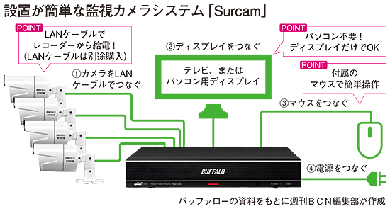 バッファローは昨年8月、法人市場向けの主力製品として、小規模店舗やオフィス向けの監視カメラシステム「Surcam(サーカム)CR1000シリーズ」という自社開発製品を発売した。事業部門営業部門担当営業本部長の渡邊泰治・常務取締役によれば、「どの市場をターゲットにするかといったテストマーケティングの期間を含め、1年弱をかけて自社開発した」と、法人市場を攻めるために開発体制を強化したうえで、同社の開発力を結集して完成させた製品という。
