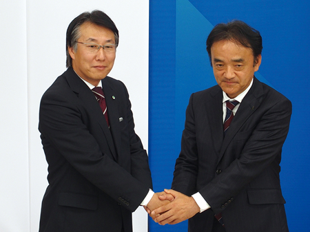 日立製作所の森田和信・産業・流通ビジネスユニットCLO(左)、オークマの家城 淳・常務取締役