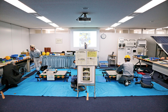 また、競技会場となった技能開発訓練施設の「テクニカルスキルデベロップメントセンタ」では、高所や足場が不安定な施工現場や、電源が入ったままのサーバー、ATMやIT機器を設置する“床”を模したコンクリート板など、技術者が現場で直面する環境を忠実に再現。コンクリート板のなかには配管や配線が埋め込まれており、競技者は埋設物の探査装置を使ってどこに埋まっているかを調べ、埋設物を痛めないよう機器を固定するボルトを打ち込む(写真2参照)といった、本番さながらの緊張感溢れる競技会となった。