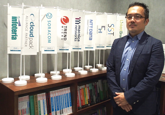 中川誠一・執行役員 Cloudpack事業部長。旗は、Cloudpackのパートナー企業