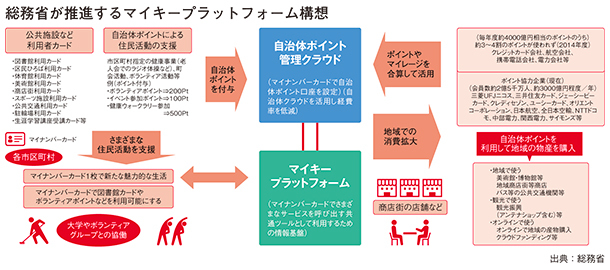 マイキープラットフォーム運用協議会が取り組むのは、各自治体への自治体ポイントの導入である。自治体ポイントは、各自治体が運用し、1ポイントを1円として利用できるようにすることが想定されている。使用できるのは、地域の商店や公共施設などの支払いで、まさに地域通貨としての役割を担う。地方創生につながる施策として期待されるのは、そのためだ。これまでも、住民基本台帳ネットワーク(住基ネット)をベースとした地域ポイント(地域通貨)の実証実験が行われてきたが、システムの維持ができないなどの理由から定着しなかった。その課題を克服するべく、自治体ポイントでは主に次の二つの取り組みを行う。