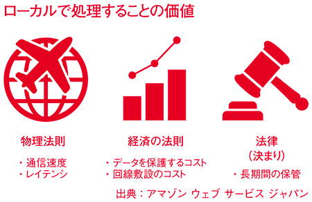 AWS Greengrassを提供する背景として、アマゾン ウェブ サービスは、図のようにローカルで処理することの価値を用いて説明している。