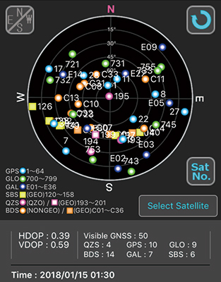 測位衛星の位置を再現するアプリ「GNSS View」。日米欧中露の5か国の測位衛星などを表示。