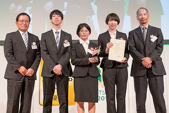 左から、JBCCホールディングスの山田隆司代表取締役社長、喜田真吾さん、濱口実弓さん、小山紗希さん、クオリティソフトの小椋量友紀取締役