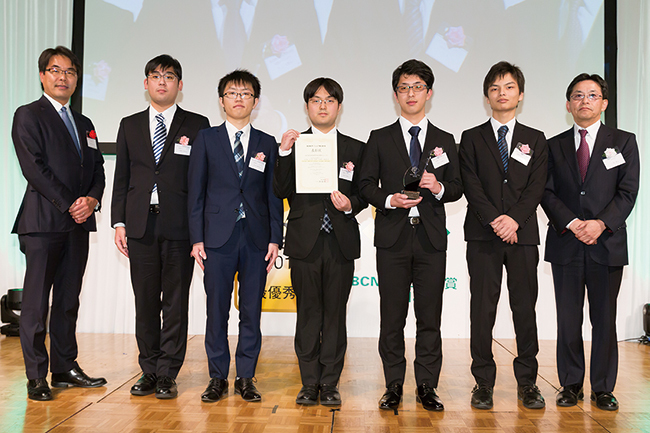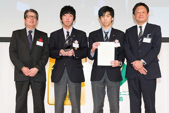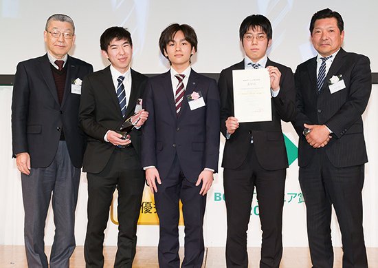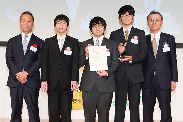 左から、アイ・オー・データ機器の細野昭雄代表取締役会長、黒土直斗さん、山上翔さん、永薗朋弥さん、オービックビジネスコンサルタントの石原徹広域営業ブロック部長