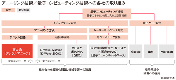 量子コンピューティング技術は、イジングマシン方式と量子ゲート方式の大きく二つに分けることができる(図)。富士通のデジタルアニーラは、アニーリング方式のコンピュータである。