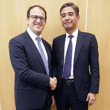 日本展開に向けた協業で握手するドローンデプロイのマイク・ウィンCEO(写真左)と
