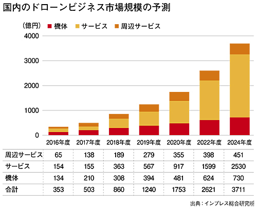 実際、インプレス総合研究所の「ドローンビジネス調査報告書2018」によれば、2017年度の国内ドローンビジネス市場規模は前年比42%増の503億円で、18年度は前年比71%増の860億円、24年度には3711億円と、うなぎのぼりで拡大する見込みだ。ポイントは、増加する市場規模の大部分を、農薬散布や空撮、工事の進捗管理、土木測量などのサービスビジネスが占めること。サービスの市場規模は17年度は363億円と全体の42%だが、24年には約7倍の2530億円で全体の68.1%となる。ドローンの本体以上にビジネスチャンスは大きく、用途に応じた各種アプリケーションの需要も期待できる。