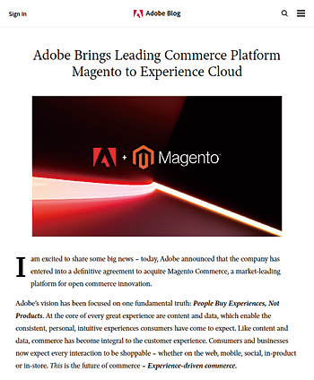この問題を解決し、ECというチャネルにおいても統一した顧客体験を提供するため、アドビはECシステム「Magento」を開発するマジェントコマースの買収に乗り出した。買収金額は16億8000万ドルで、オムニチュアを買収した際の18億ドルに迫る大型のM&A案件となり、今年夏の手続き完了を見込んでいる。