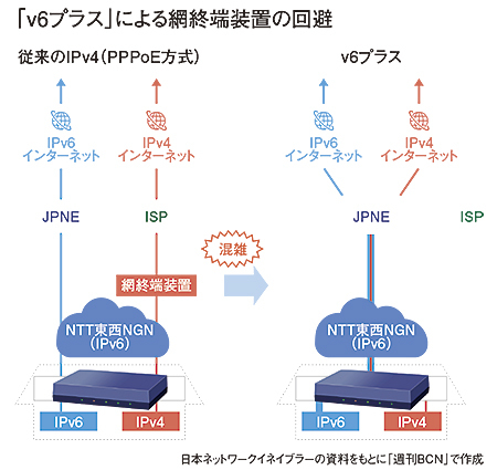 この方式では、網終端装置を通らないため混雑の影響を受けないが、IPv6に対応していないホストに直接接続することはできない。しかしVNE各社は、IPv6ネットワークにIPv4パケットを流す「IPv4 over IPv6トンネル」サービスを提供しており、これを利用することで、IPv4にのみ対応する従来のウェブサイトなどにも、網終端装置の混雑に影響されず快適にアクセスできるようになった。