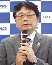 エプソン販売の吉崎宏典・取締役 特販営業本部長は、大判プリンター市場について「インク数別に市場をみると、8色以上の多色機のカテゴリーシェアは2割で、4色機が8割を占める」と説明。さらに、カテゴリー別の同社のシェアでは、多色機市場では39%を獲得しているが、4色機市場では19%とやや低い。大判プリンター市場でシェアを高めるためには4色機の製品、販売戦略を強化する必要があるとした。「4色機市場でシェアが低い要因は、製品ラインアップの少なさにある。そこで今回新製品を投入することにした」と吉崎取締役は話す。