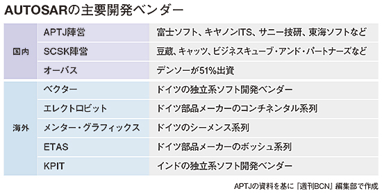 ライバルとなるのは、欧州/インドの海外勢、ならびに国内ではSCSKや豆蔵、キャッツなどが共同で開発する国産AUTOSAR製品「QINeS(クインズ)」と、デンソーが51%出資するオーバス。自動車部品メーカーの系列を除く、独立系のソフト開発ベンダーのみに絞るとドイツのベクター、インドのKPIT、SCSK陣営などに絞られてくる。さらに、例えば同じトヨタ系列でも、デンソーが自前でAUTOSAR開発子会社を持つ一方、豊田自動織機がAPTJの開発に協力するなど、完成車メーカーから見て「複数のベンダーを競わせる」構図も存在する。