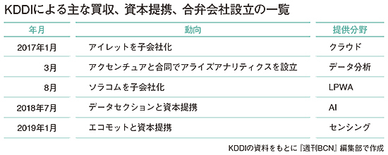 KDDIは1月15日、IoTインテグレーション事業を手掛けるエコモットが発行する株式の21.1%を取得。持分法適用関連会社とする形で資本業務提携した。金額は非公開だが、15日付の終値から換算すれば約13億5000万円となる。