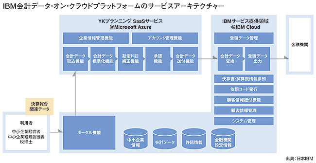 サービスのアーキテクチャーとしては、日本IBMがIBM Cloud上にポータル機能などサービスの中核となる機能を構築し、中小企業はプロジェクト参画ベンダーの会計ソフトで作成した決算データをポータルを通じてIBM Cloudに送る。この時点では、会計ソフトごとにアウトプットのフォーマットが異なるが、これを同プロジェクトの協業ソリューションベンダーであるYKプランニングがMicrosoft Azure上で提供するデータ変換処理サービスで共通フォーマットにそろえる。その上で、データをIBM Cloudに戻して金融機関側に渡すという流れだ(図参照)。