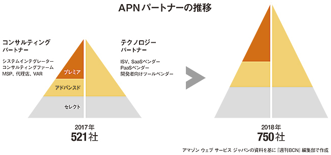 AWSのパートナープログラムである「APN(AWS Partner Network)」の国内パートナーは、2017年末の段階では521社だったが、18年末には750社まで増加したという。16年末から17年末にかけてのAPNパートナーの増加分は130社なので、1年で増加したパートナー数の絶対値も2倍近くに跳ね上がったことになる。