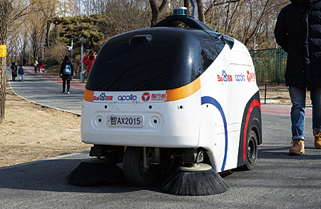 例えば、公園内のランニングコースは、顔認証技術を活用した「スマート歩道」になっている。利用者は、事前に顔を登録し、スタート地点に立ってカメラで顔を撮影する。その後、コースを走り、ゴールすると、1周のタイムや総運動時間などのデータが集計され、ディスプレーにランキングが表示される。このほか、地面に設置されたけん盤の上に乗ると、音が鳴るようになっていたり、百度の自動運転技術を搭載した無人掃除ロボットが走り回ったりしている。つまり、公園全体を対象に、百度が実証実験を展開しているわけだ。