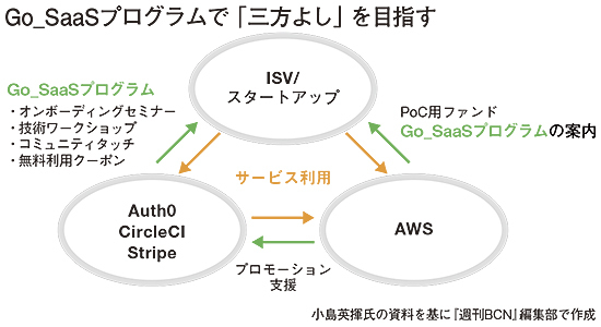 プログラムに参加するISVの獲得は、主にAWSジャパンがその役割を担う。同社はGo_SaaSプログラムをテコに、自社のISVパートナーの拡充も狙う形だ。小島氏は、「Go_SaaS 三種の神器プログラムはISVにとってメリットがあるのはもちろん、利用が広がることでAWSも3社もユーザーが拡大していく『三方よし』のスキームになっている」と強調する。