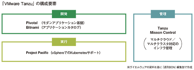 しかし、これまでのVMware環境は文字通り仮想マシン(VM)技術をベースとしており、コンテナ化されたクラウドネイティブアプリケーションの管理・運用には、別途Kubernetesなどの環境を用意する必要があった。Tanzuポートフォリオは、近年相次いで買収してきたへプティオやピボタルなどの技術やノウハウを従来のVMware製品に統合し、VMからコンテナまでを包括した、ソフトウェアの開発・実行・管理プラットフォームとなることを目指すものだ。